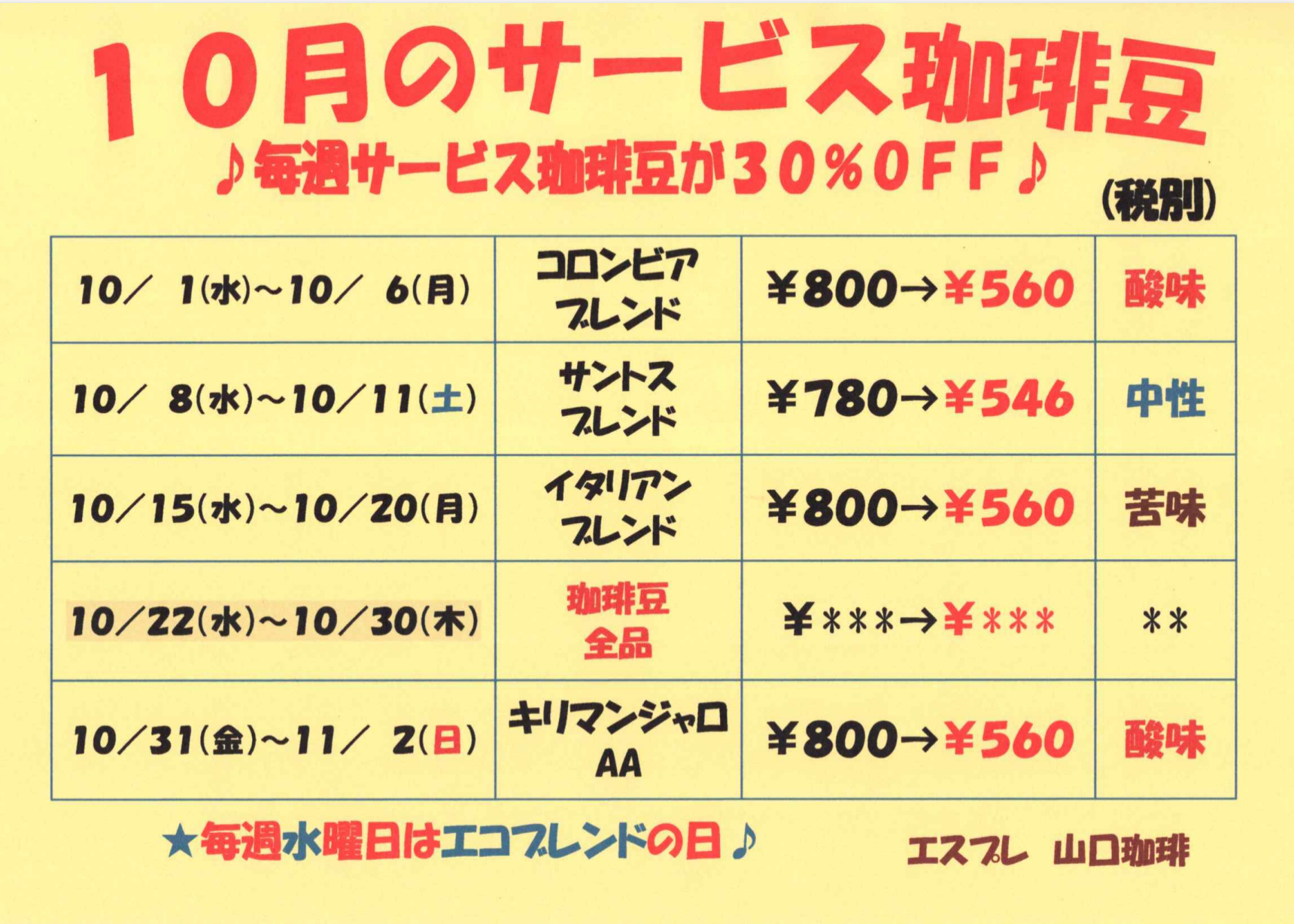 コーヒー豆は、お好みに挽いてお渡しできます。毎週、サービス珈琲豆は定価の30%OFFで販売しています!